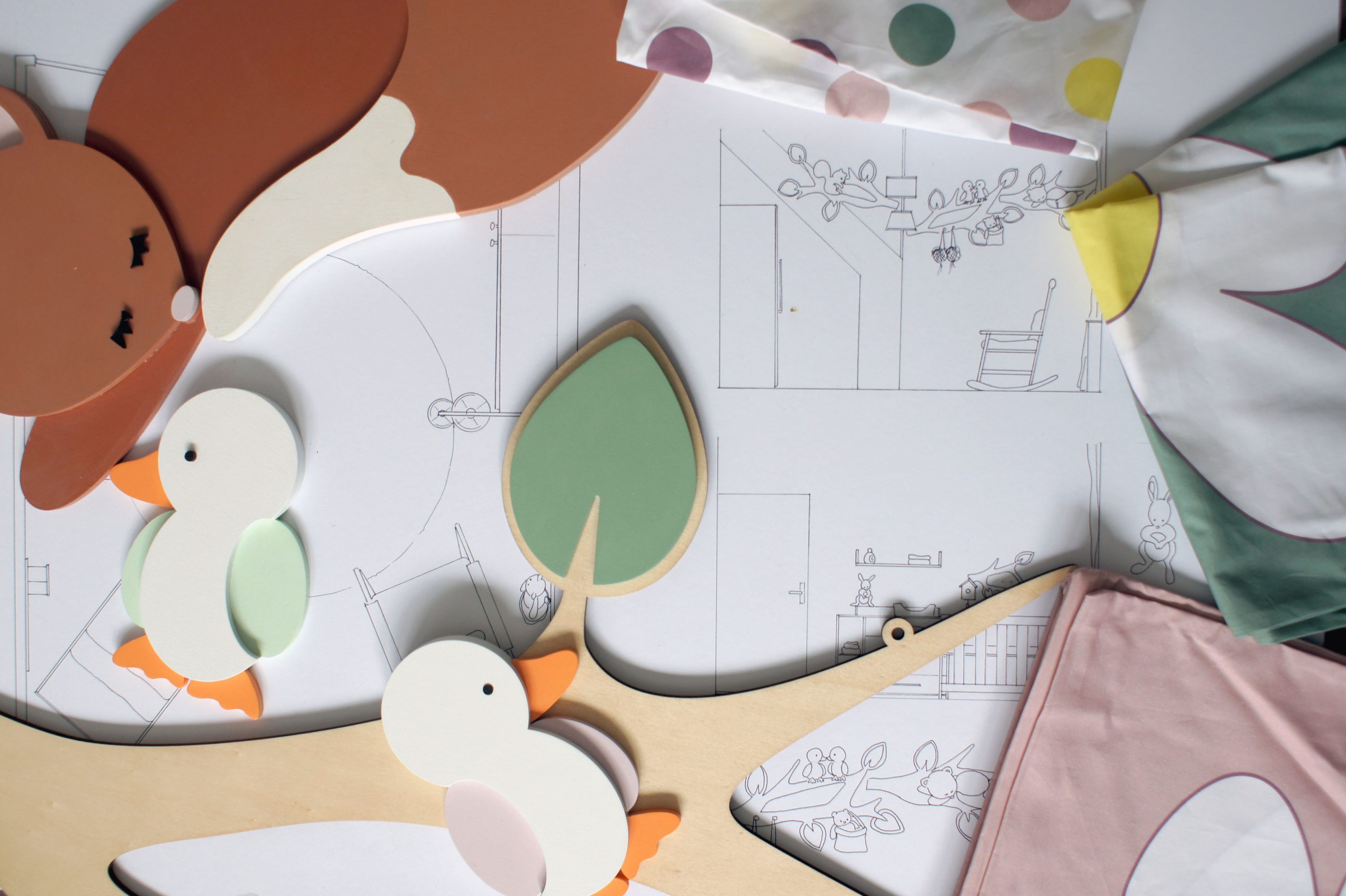 Deze bosbeestjes en wanddecoratie zijn op maat gemaakt. De wandtakken, vogeltjes, vos en haas zijn in reliëf uitgevoerd en met de hand samengesteld. Ook de muziekdoos is door ons op maat gemaakt.
