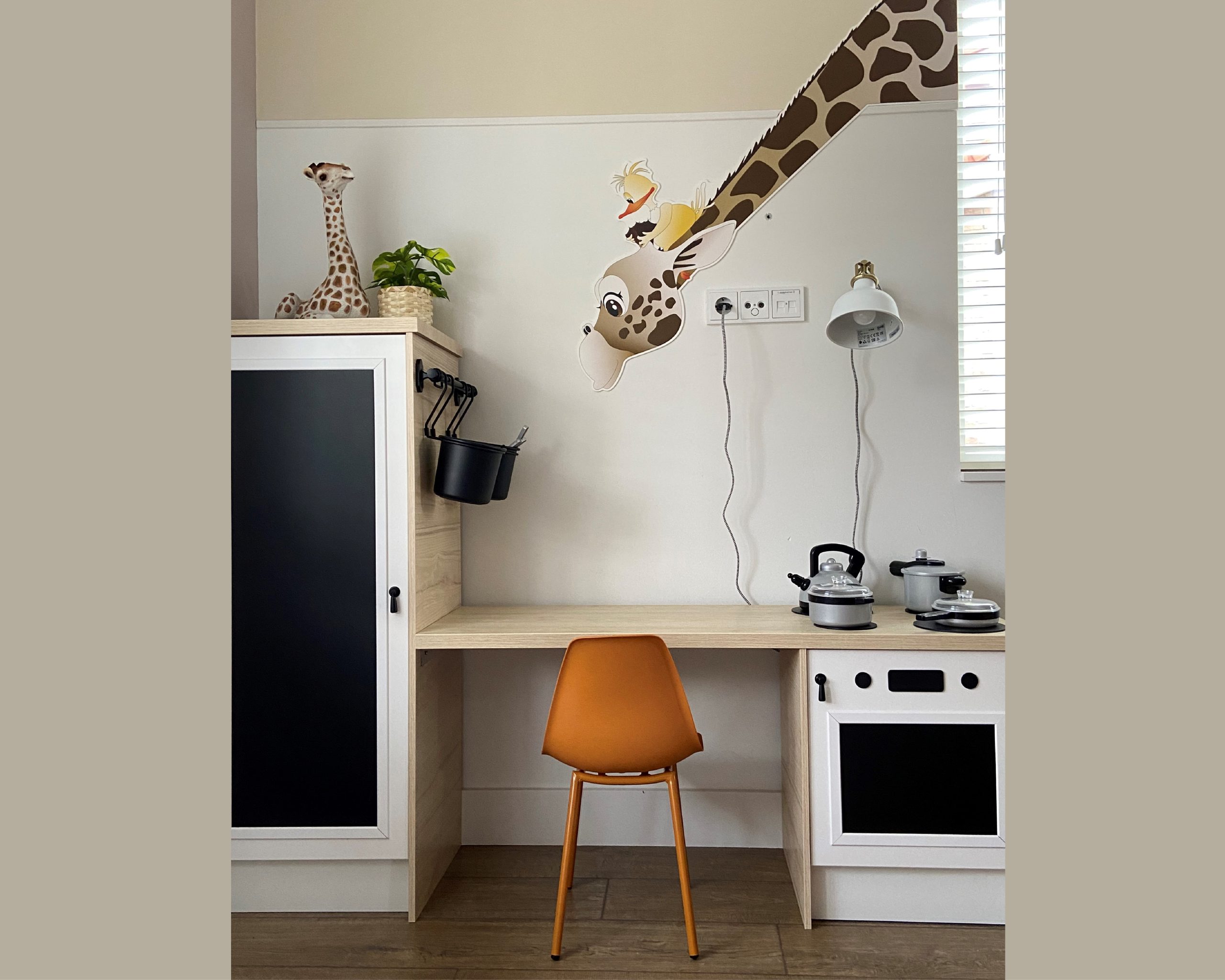 De wanden zijn uitgevoerd in gematigde tinten met een scheiding van kleur aan de bovenzijde. Hierdoor accentueer je de hoogte van de lange giraffen die speels over de rand de ruimte in kijken.